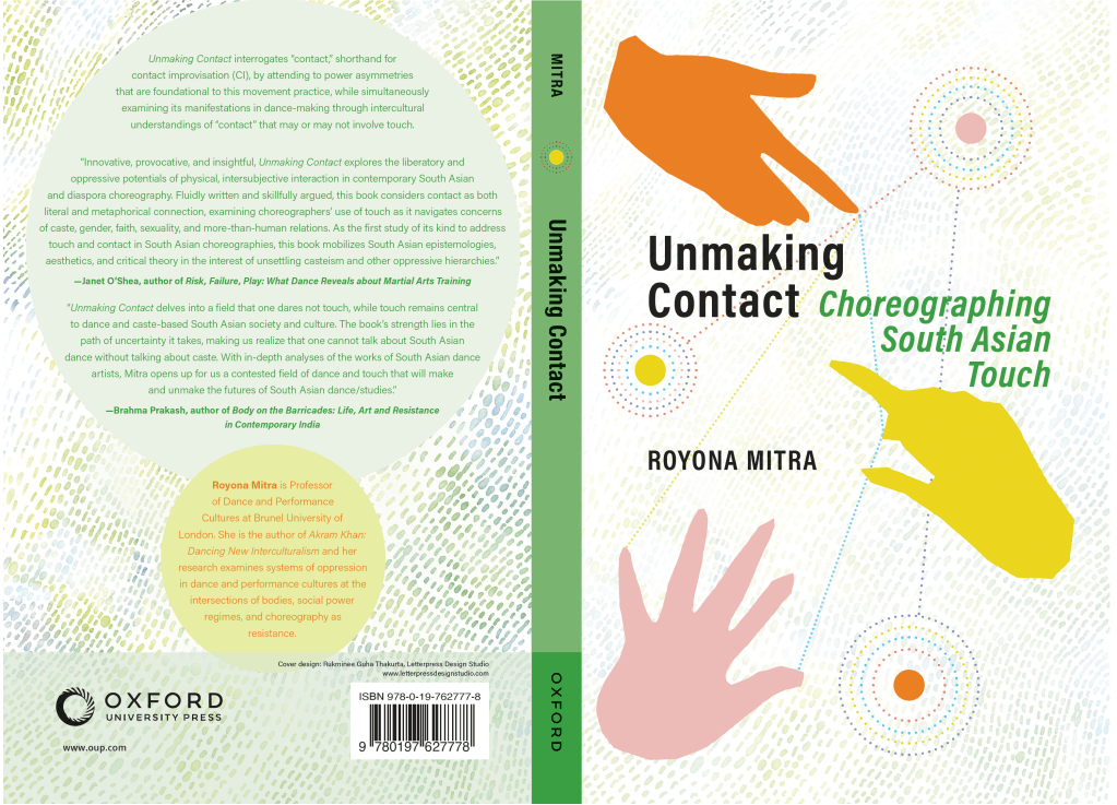 Unmaking Contact: Choreographing South Asian Touch (2025, Oxford University Press) interrogates “contact,” understood in Global North dance discourse as a shorthand for the movement discipline of contact improvisation (CI) and its characteristic shifting points of weight-sharing between two or more bodies through physical touch, by attending to inherent power asymmetries that are foundational to this practice. By placing South Asian aesthetics, bodies, discourses, and philosophies on touch at the heart of its interrogation through the lenses of caste, ecology, faith, gender, and sexuality, the book argues for an intersectional, intercultural, and inter-epistemic understanding of contact that may or may not involve touch. The book shifts and expands understandings of “contact” in dance-making through intercultural epistemologies that examine notions of touch and contact, which are often used interchangeably in Global North dance discourse. In this book, the term “contact” signals both a shorthand for CI and a shift away from it to more expansive choreographic considerations: it becomes an apparatus for dismantling power regimes (Chapter 1); it is conjured as a catalyst to examine power in social relations (Chapter 2); it appears as a fulcrum of ecological relationality (Chapter 3); it arises as critical encounters full of generative and transformative potential (Chapter 4); and finally, it manifests as community (Afterwords). The book examines the interconnections between these expansive and varied manifestations of “contact” and their relationships to physical touch, by foregrounding South Asian aesthetics, artistic practices, philosophies, and voices of four transnationally located South Asian–heritage dance-artists—India-based Akila and Diya Naidu, UK-Pakistan-based Nahid Siddiqui, and US-based LaWhore Vagistan—who become the touchstones of each of the chapters and the Afterwords.